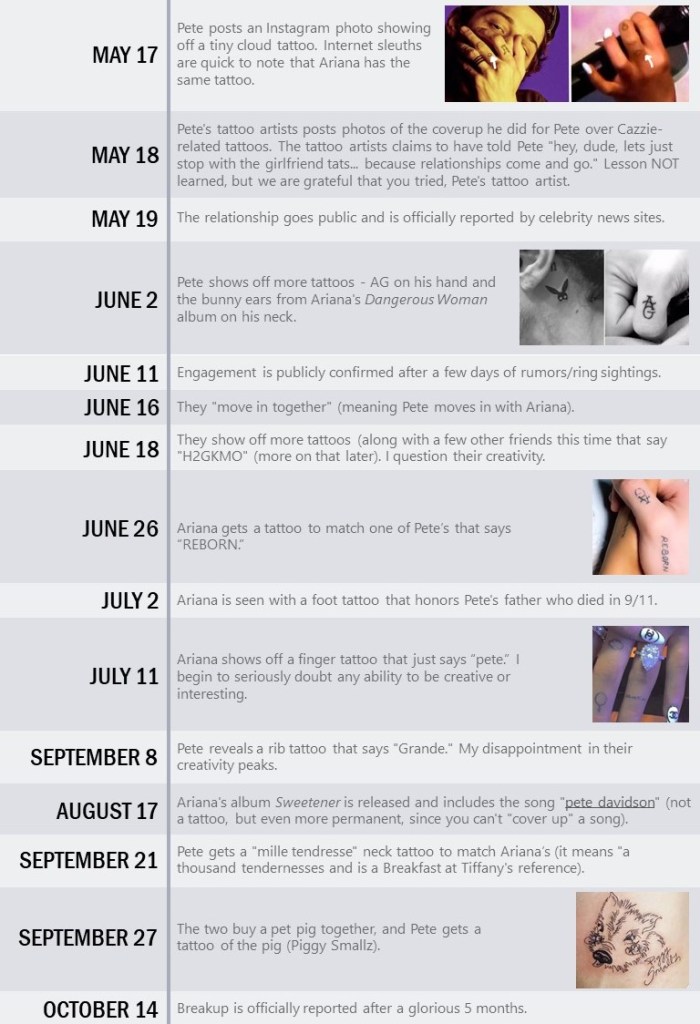 Along with these exciting fashion moments, Pete and Ariana covered their bodies with an abundance of tiny and ill-advised tattoos. Is it really true love if you aren’t in the artist’s chair at least once a week? Following is a timeline of their tattoos love.