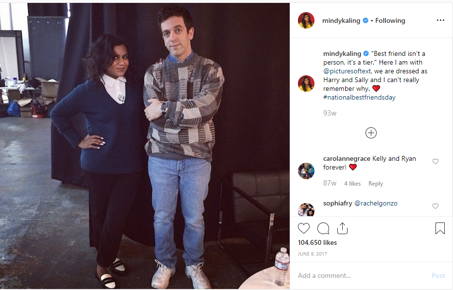 When Mindy posted a behind the scenes photo on Instagram for National Best Friends day she said, “here we are dressed as Harry and Sally and I can’t really remember why. ❤️”
