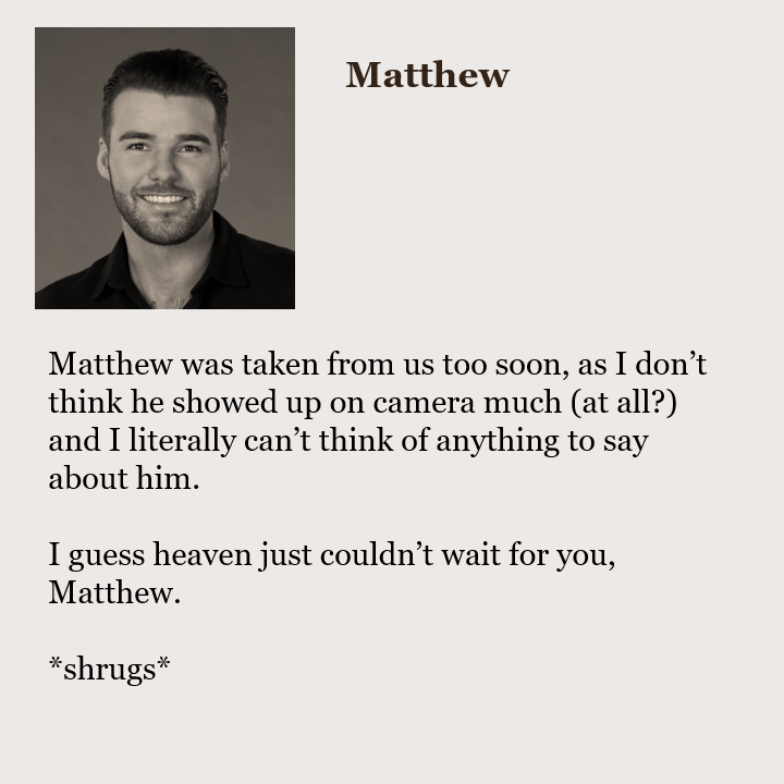 Hannah had her first one-on-one with Tyler G. They rode around on ATVs in the mud, then sat on a couch and had a boring, but nice enough chat. It was all fine, but I don’t see Tyler G making it to the end.