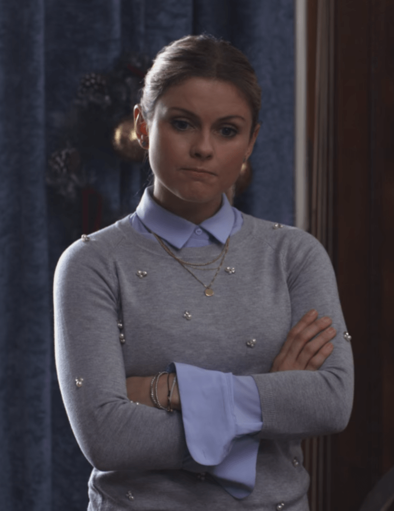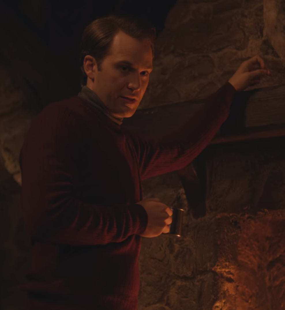 Later, the family gathers to decorate the Christmas tree and we are introduced to two more characters. One is a giant wooden acorn ornament that was hidden away by the late King as a surprise for Queen Helena. Everyone gushes over it’s beauty (it’s not that beautiful, it’s just a giant acorn; but it does come into play later). The other is Sophia — Richard’s ex-girlfriend and plotting, evil partner of Cousin Simon. She gifts the family with a shiny ornament and asks Richard to “be gentle with it” as he hangs it on the tree. I am convinced that this was supposed to be sexual in some way, but I cannot work out how.