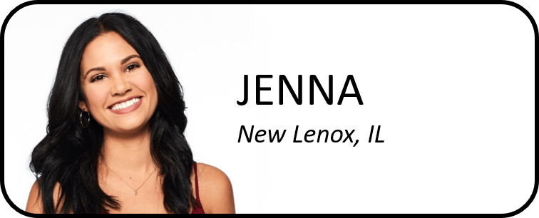 Jenna is a fun, down to earth, Midwestern girl. She’s looking for a man to grow old with who can keep life exciting. She wants someone who is kind and nurturing, but also spontaneous and adventurous. After a life-changing trip to Africa for a medical mission, Jenna realized that she needed to start doing activities to make herself happy and not be such a pushover. When she’s not working her tail off to get her nursing degree, she loves to go take the Chicago nightlife by storm where she can often be found leading her trivia team to victory and shooting darts. Jenna’s biggest fear in this whole process is being sent home before getting a chance to show Peter all that she has to offer, but we don’t think she has any reason to be worried.