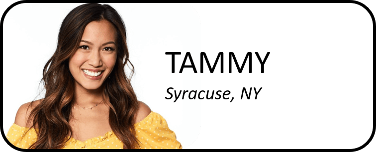 Tammy is in the process of taking over the world and if a man can’t keep up, then she isn’t afraid to leave them in the dust. She comes from a hardworking family that immigrated over to Syracuse during the Vietnam War and credits her go-go-go attitude to her parents. After her parents split up, she helped raise her younger sisters and has been working ever since graduating high school. Speaking of high school, Tammy tried to join the boys wrestling team as a junior but was turned away! She responded by showing up to every practice and pushing forward on a Title IX complaint until they accepted her. Good thing they did, because once on the team, she went on to have a 7-1 record wrestling on the boys’ varsity team. Tammy’s busy work life hasn’t given her too much time to date. She has been unable to find anyone in Syracuse who can keep up with her ambitious nature, and she finds it hard to date men her age because her drive tends to intimidate them. Tammy is coming into this experience to focus on finding true love and to see if Peter is the type of guy who can give her the work-life balance she needs. One problem though: Tammy hasn’t told her mom yet that she’s going to be on The Bachelor. Guess now is as good a time as any! Surprise, Mom!