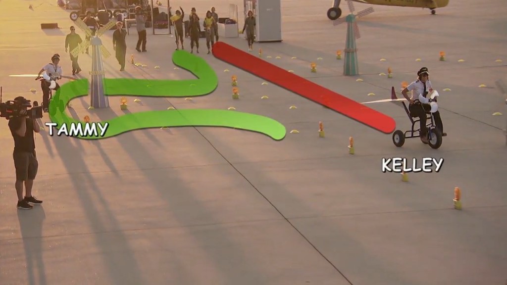 The last part of the contest is an obstacle course that ends with a tricycle ride around some cones. Kelley and Tammy are in front, racing toward the finish line, when Kelley forgoes the correct course layout and just bee-lines for the finish line.