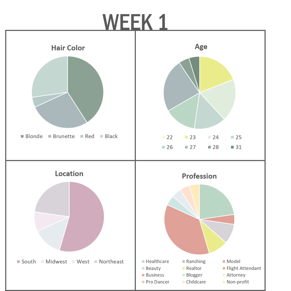 I present to you a collection of pie charts reflecting the breakdown of a few aspects of the contestants – hair color, location, age, and profession. I will update the charts each week as Peter sends women home, and I’m sure we will learn absolutely nothing from this information. You’re welcome!